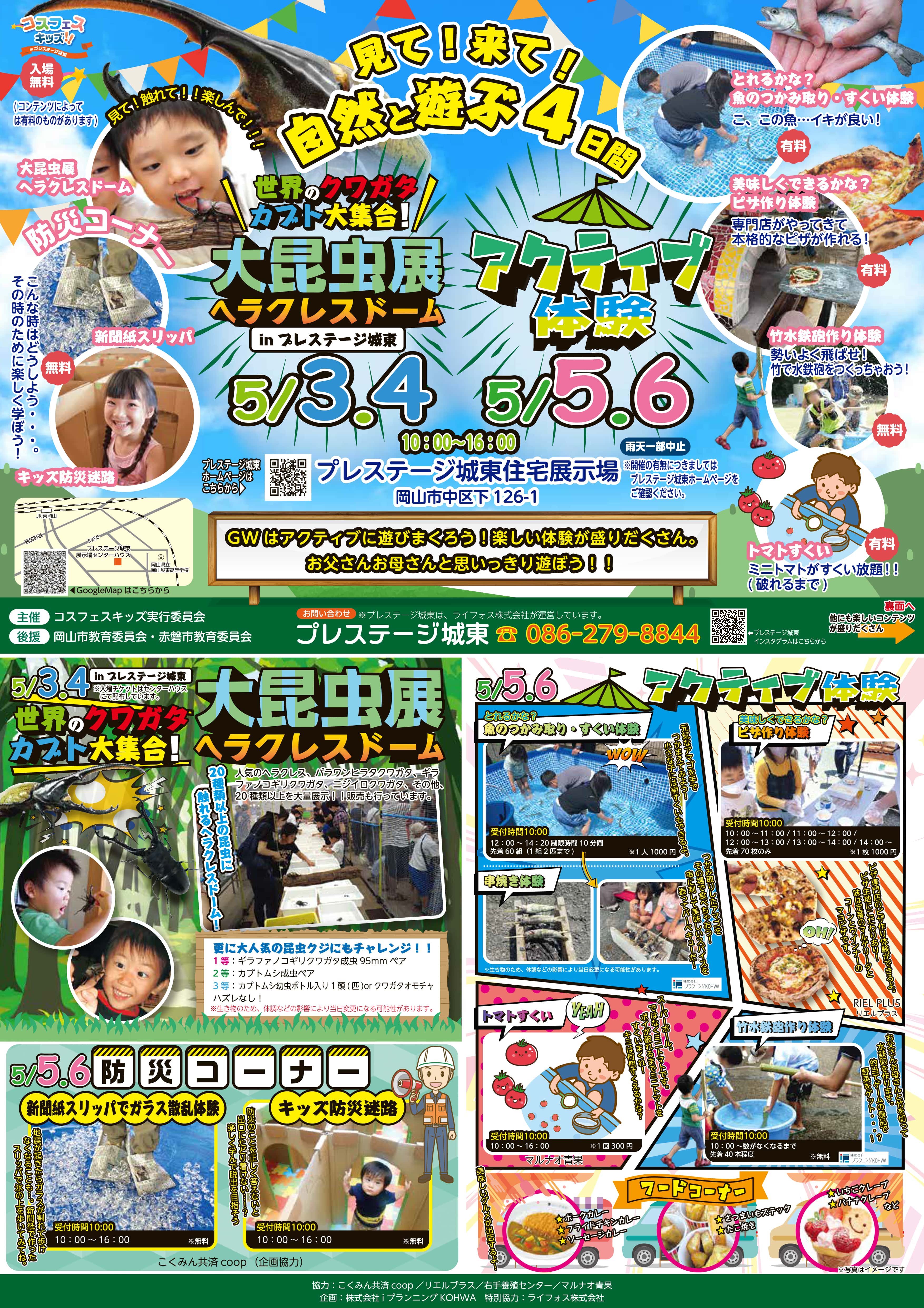 5月5日(月・祝)、6日(火・祝)は、親子で自然体験をテーマに魚のつかみ取りや、竹水鉄砲、トマトすくいなど体験コンテンツが盛り沢山!他にもピザ作りや捕まえた魚の串焼き体験など大満足の2日間です! 防災体験コーナーも併設!また、キッチンカーも登場予定です!GWの締めくくりはプレステージ城東へ是非お越しください!