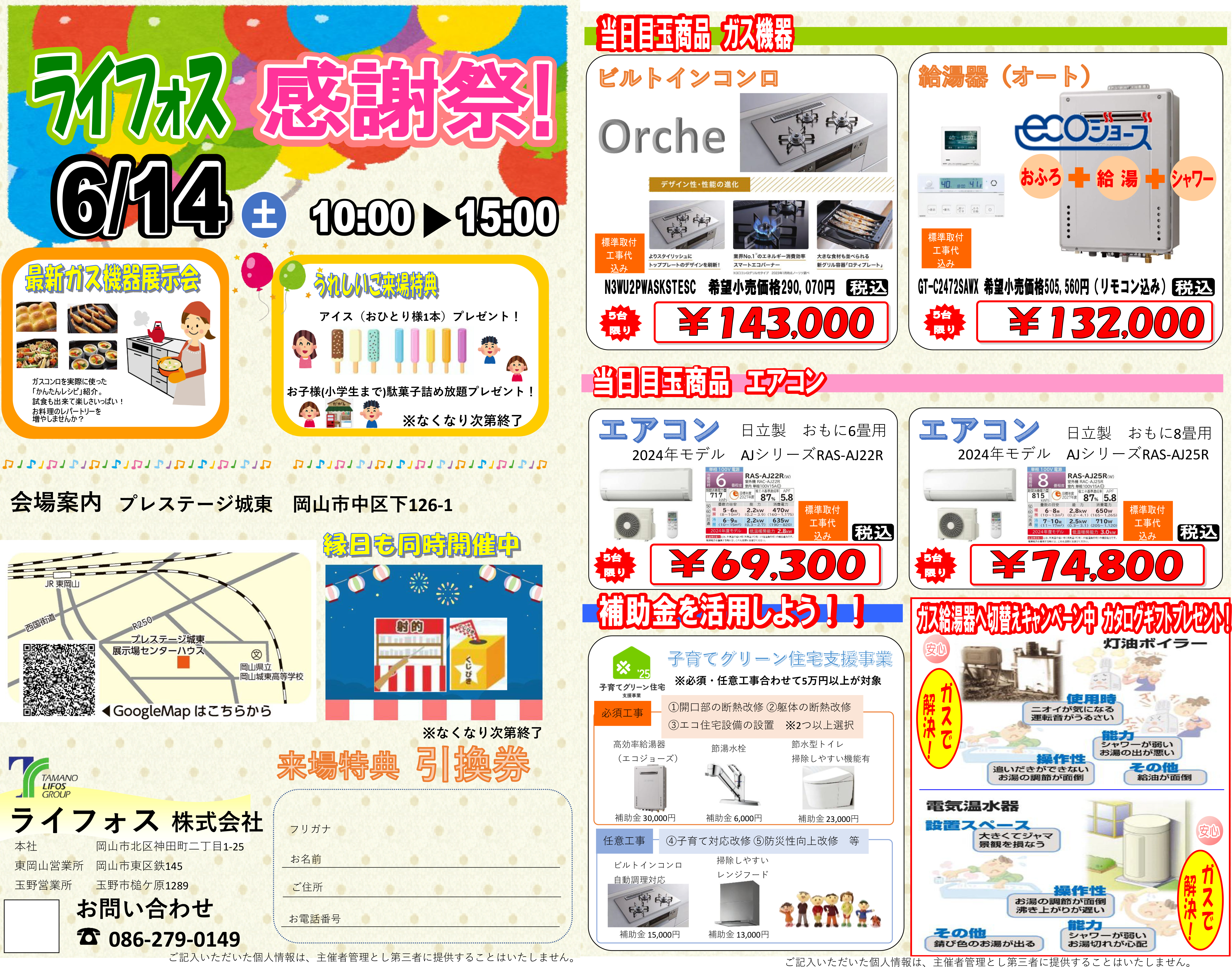 プレステージ城東 縁日フェア 日 時 / 2025年6月14日(土) 場 所 / プレステージ城東内 イベント会場 時 間 / 10:00~17:00※最終受付は16:30までとなります。 むかし懐かしい縁日の屋台がプレステージ城東に集結! アンケート記入でお子様全員に縁日1人1回無料チケットを配布します。 さらにご家族全員にもアイスプレゼント! ※当日限り有効となります。 当日は、プロパンガスイベント「ライフォス感謝祭」も同時開催! こちらも是非ご来場をお待ちしております。
