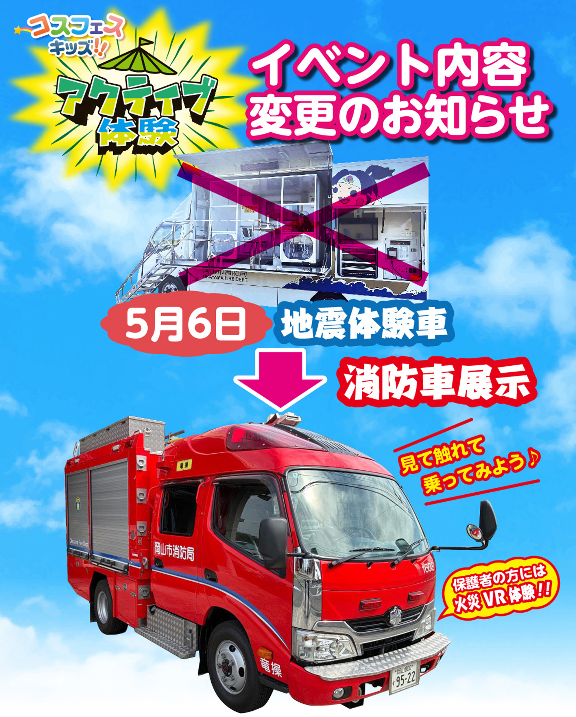 ※5月6日の地震体験車は、消防車の展示に変更となりました。